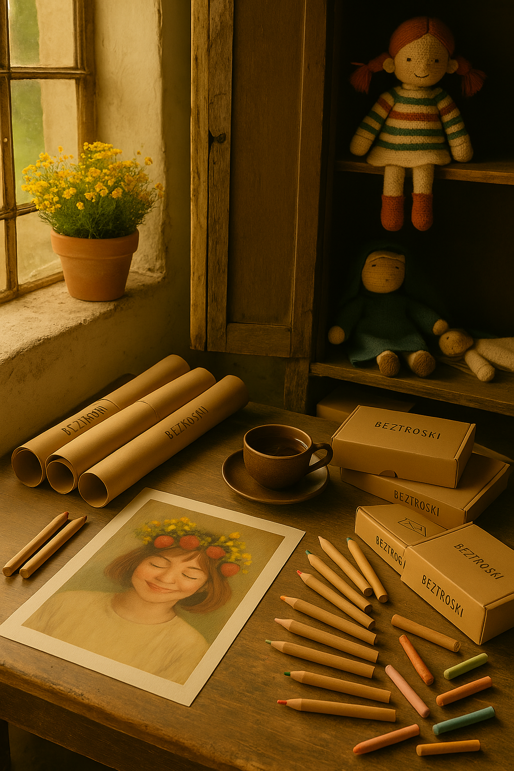 Znajdziesz tu ręcznie malowane ilustracje akwarelowe i artystyczne plakaty przyrodnicze; od sielskich scen z dzieciństwa po dziką florystykę i polne kwiaty. Tworzę z myślą o tym, by Twoje wnętrza, także pokoje dziecięce, wypełniały subtelność, nostalgiczny klimat i spokój płynący z życia w rytmie slow.